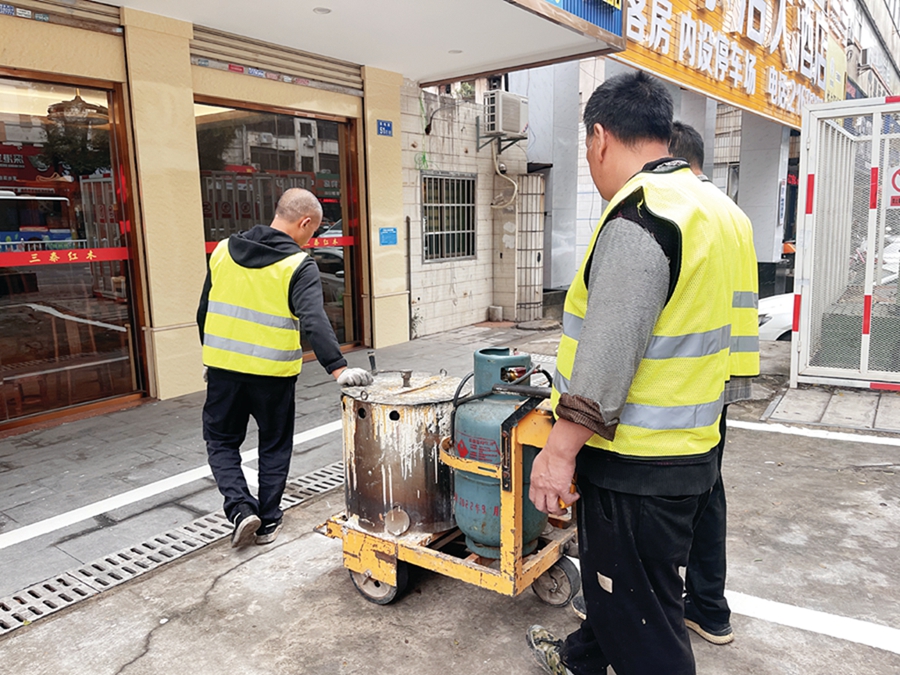 工作人員在開展停車格劃線工作。 惠州日報記者鄧惠婷 特約通訊員周文媚 通訊員曾苑嬌 李雙飛 攝