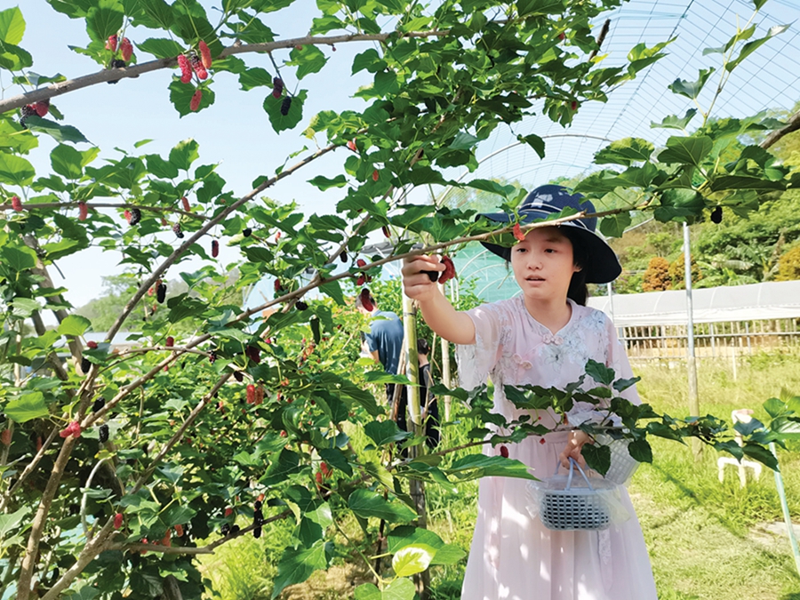 最美人間四月天。美麗的惠城不僅到處鮮花盛開,還有桑葚成熟進入采摘期。記者日前在位于小金口街道九龍村的惠城區紅色東江五育實踐基地看到,市民趁著周末帶孩子來此開展采摘活動。熟得發黑的桑葚掛滿樹梢,引得大人小孩盡情享受大自然的饋贈,體驗親子采摘的樂趣。