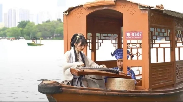 游湖會上,漢服小姐姐為游客演奏民樂。