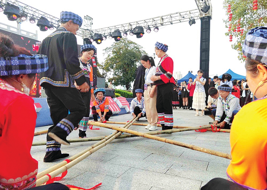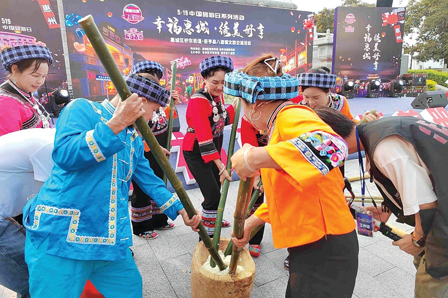 當天,在身著布依族盛裝的男女青年引領下,惠城區橋東街道和貴州省黔西南布依族苗族自治州冊亨縣八渡鎮干群一起共跳竹竿舞,拉開了活動的序幕。竹竿舞跳完,布依族男女青年掄起特制的竹棒,喊著口號,搗鼓石槽里的糯米飯,現場干部和群眾也紛紛參與其中,感受濃郁的民族風情。