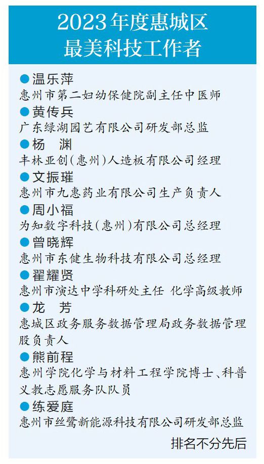 活動中,惠城區2023年度“最美科技工作者”評選結果出爐,10位“最美科技工作者”獲此殊榮。他們聚焦前沿科學問題和關鍵技術的突破,努力成為服務經濟社會高質量發展的推動者,成為助推科技自立自強的排頭兵。接下來,還將舉薦優秀科技工作者參評區拔尖人才、惠州市“天鵝計劃”“廣東省丁穎科技獎”等評選活動。