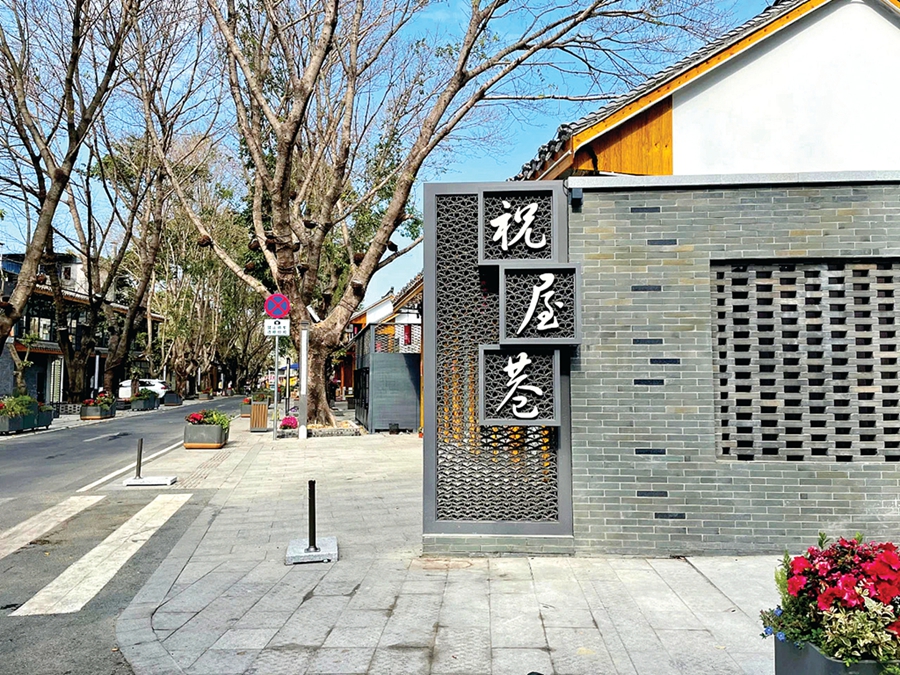 在祝屋巷的兩旁遍布著許多好玩有趣的文創與美食商鋪,新舊結合的建筑風格、充滿設計感的文化墻,搭配路旁的綠樹與湖邊的美景,真可謂如詩如畫。