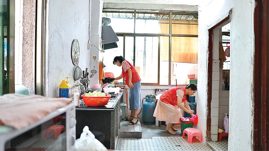 廚房里清洗食材和炒菜的聲音交雜傳來,七旬嚴婆婆倚著墻看著兩個忙碌的身影,內心很是感動。