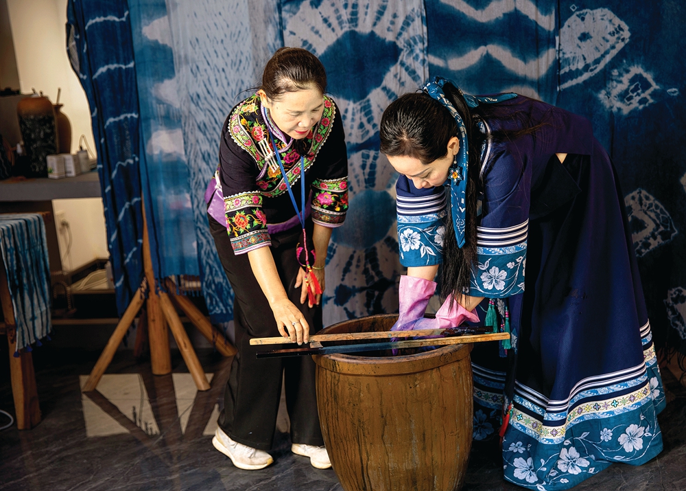 周丫非常喜歡民族特色,到冊亨后,她被布依族文化深深吸引,經(jīng)常穿著布依族的服裝拍視頻、唱歌等。她向蠟染非遺傳承人虛心請教學(xué)習(xí)布依族蠟染、刺繡,還在不影響教學(xué)工作的情況下接手運營新媒體號“布依一抹藍”,積極宣傳推廣布依族傳統(tǒng)文化。沒有教學(xué)任務(wù)時,她就外出采訪、拍攝,還參與直播,把當?shù)氐耐撂禺a(chǎn)推介給網(wǎng)友。