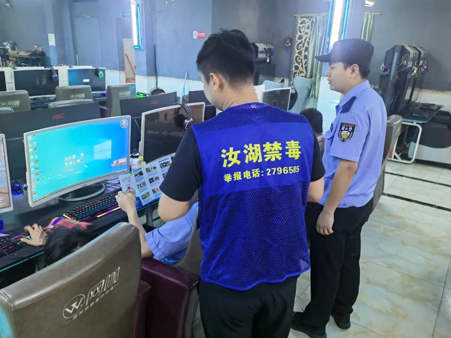 汝湖鎮(zhèn)禁毒辦工作人員在網(wǎng)吧內(nèi)開展禁毒宣傳。
