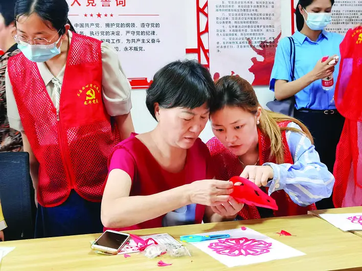 志愿者陪老人體驗剪紙活動。