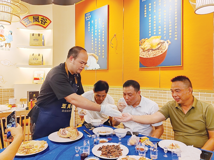 五鳳谷古法鹽焗雞負責(zé)人吳金標(biāo)與客人分享鹽焗雞。