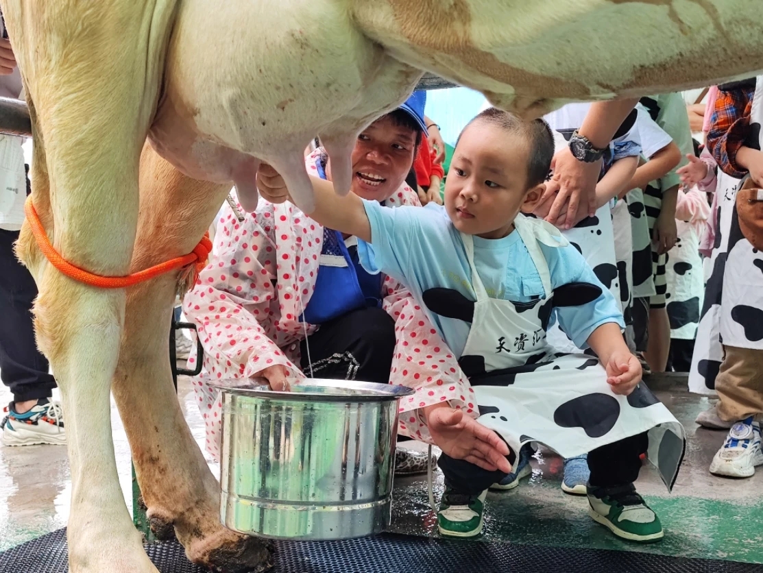 農(nóng)旅研學(xué),體驗擠牛奶的樂趣。