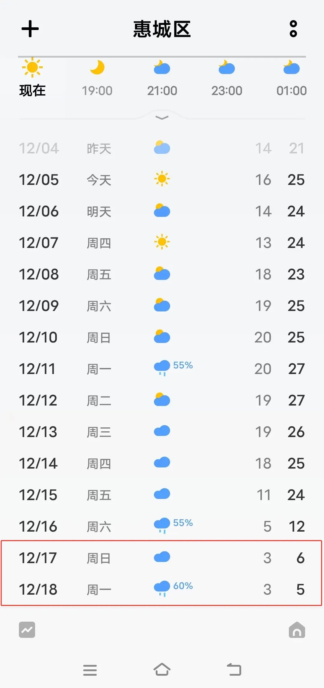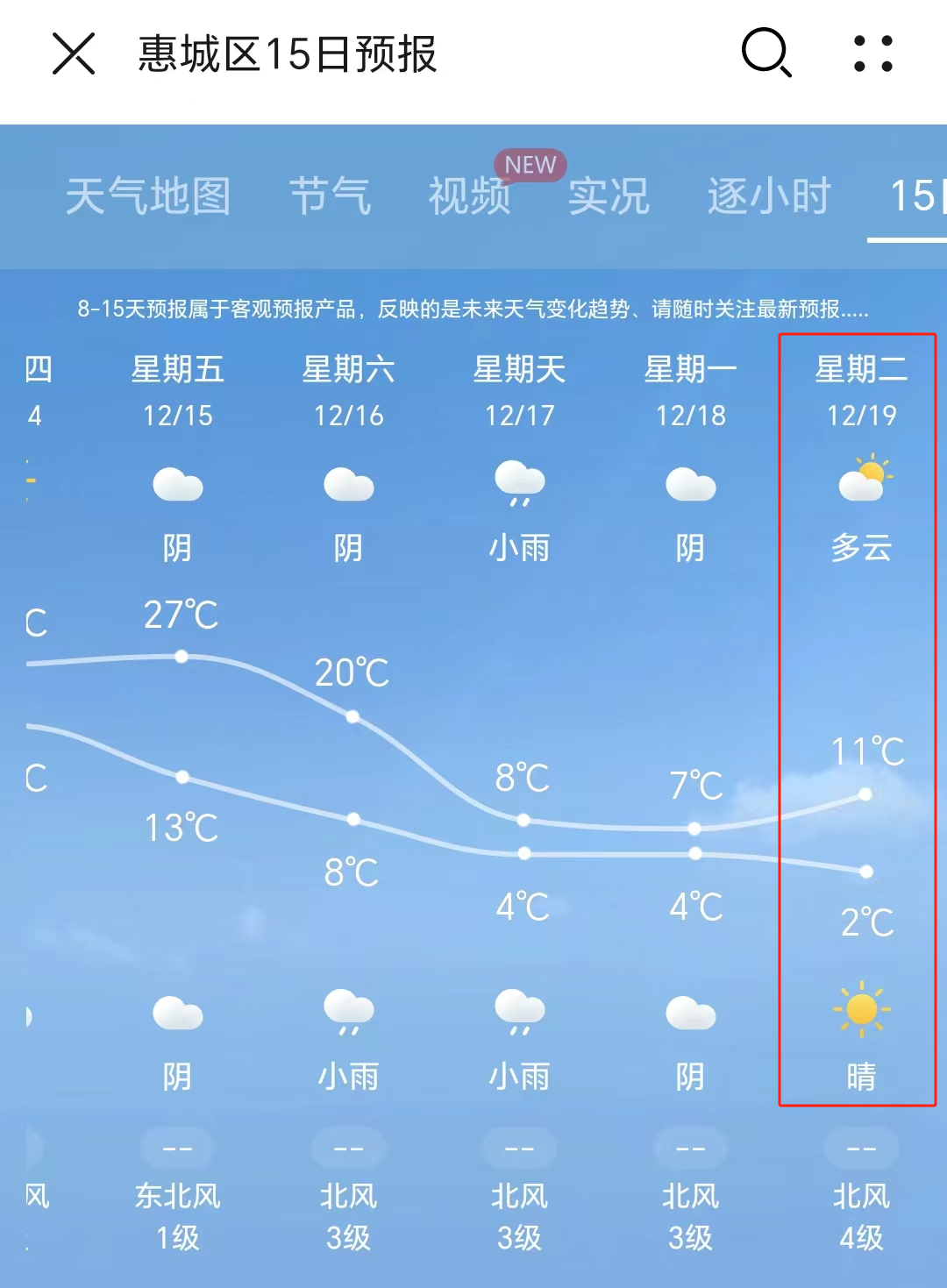 根據各網友發送給氣象部門的手機頁面截圖,上述截圖大致反映12月中旬廣東部分地區出現降溫走勢,至12月18日前后出現過程低溫。從預報結論看,屆時惠州惠城區最低氣溫僅2~3℃;廣州市區最低氣溫僅1℃,最高也僅3℃,不僅天氣寒冷還可能出現雨夾雪。