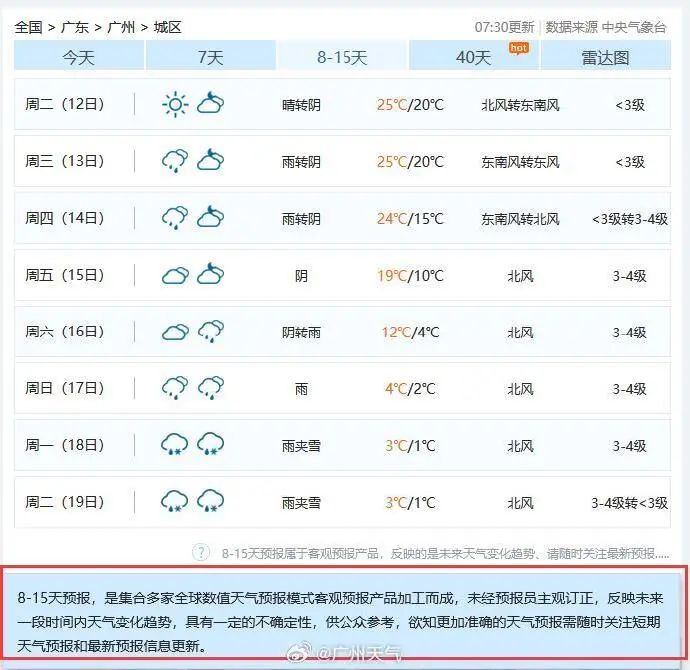 部分提供該類預報的網站會提醒公眾該類預報存在的不確定性。圖源:@廣州天氣