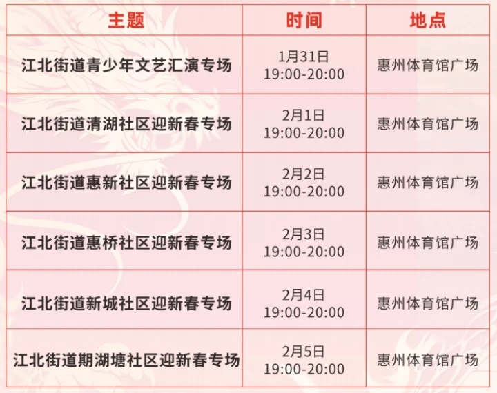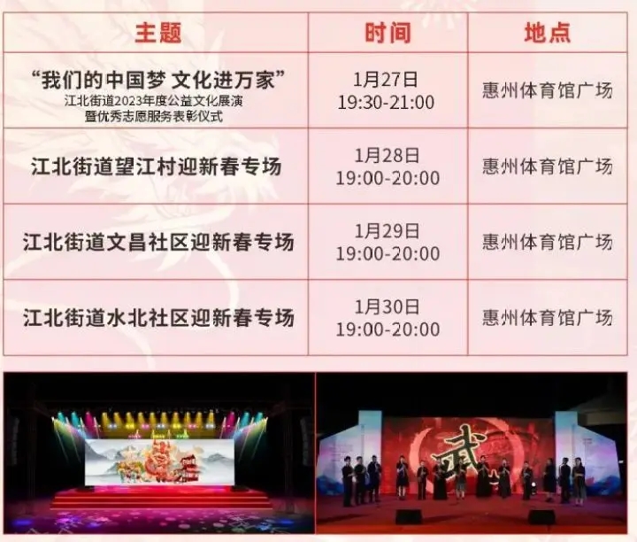 活動設置六大展區:年貨大集展區、精品花卉展區、惠州本地特色美食展區、互動游樂區、非遺文化展區、江北“文化進萬家”系列展演區