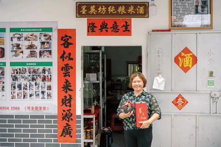 “策馬滴墨,圈地成村。”在惠城區(qū)橫瀝鎮(zhèn)東江北岸,有一座擁有四百多年歷史的古老文旅村落,名為墨園村。行至墨園村游客服務(wù)中心,便可看見寫著“英姐手工米酒”的指示牌,陣陣酒香撲鼻而來。這里便是墨英酒坊的銷售店面——英姐農(nóng)產(chǎn)品店。