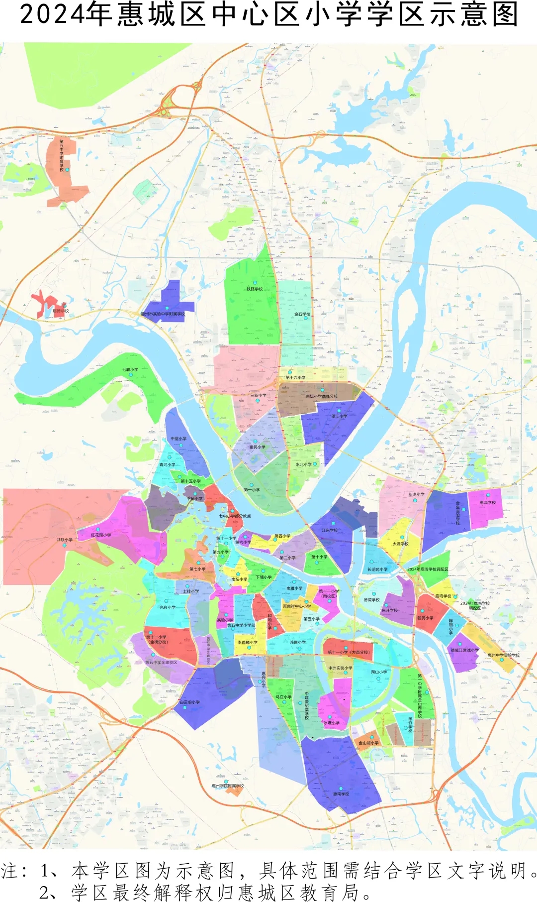 公辦小學招生遵循“屬地管理,劃片免試相對就近入學”的原則。市區中心區(指江南、江北、橋東、橋西、河南岸、龍豐共6個街道)公辦學校(含中心區外區直屬的大湖學校、新湖小學、合生實驗學校、第一小學白鷺湖分校、金石學校、鐵路學校、翠竹學校、惠博學校、德威江譽誠小學、群朗小學、惠州中學實驗學校、惠澤學校、第五中學附屬學校、鹿鳴學校)由教育行政部門依據適齡學生人數、學校分布、學校規模、交通狀況等因素,按照相對就近原則劃定招生區域。市區中心區小學學區范圍及說明詳見《2024年惠城區市區中心區小學學區示意圖》(附件2)和《2024年惠城區市區中心區小學學區范圍說明》(附件3)。因今年新開辦第五中學金峰校區、第一中學附屬金山湖學校、鹿鳴學校等3所學校,對第十一小學金榜分校、金山湖小學、翠竹學校、上排小學、白云前小學、湖山小學等學校學區作了微調,其他學校按原劃定學區不變。