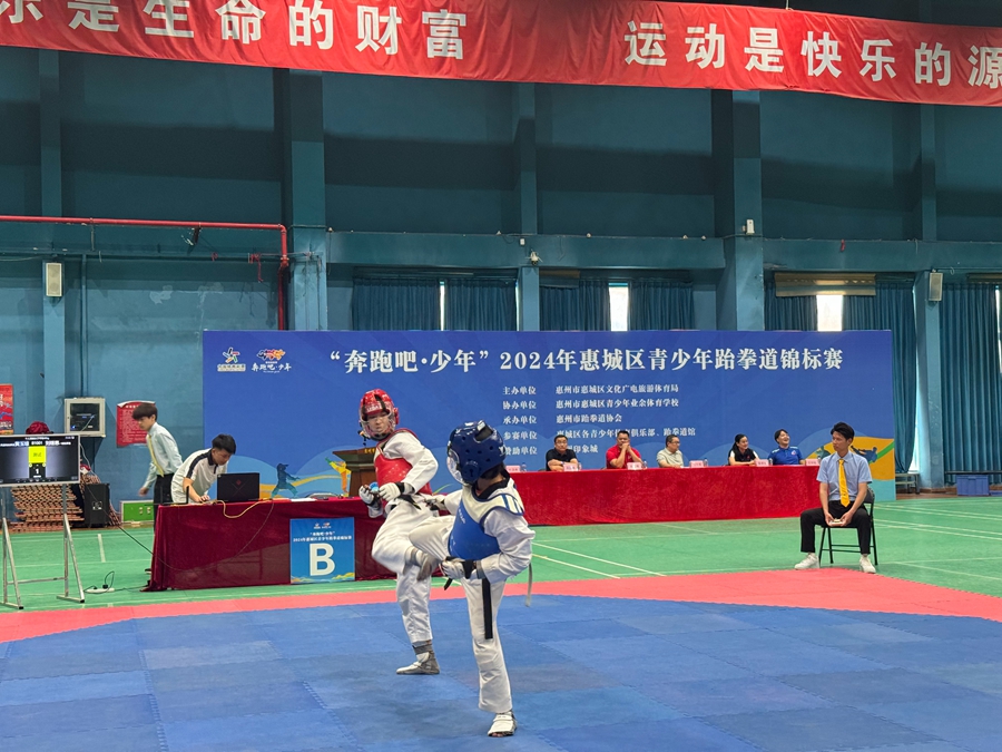 “奔跑吧·少年”2024年惠城區(qū)青少年跆拳道錦標(biāo)賽比賽現(xiàn)場(chǎng)。
