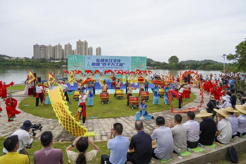 在隨后的文藝表演中,各個節目輪番上演:以東江漁家為主題情景的歌舞《鑼鼓一響慶開漁》,融合了鑼鼓、東江客家歌謠、舞龍、扇舞等藝術形式及東江漁家傳統民俗元素;漁家舞蹈《太陽出來喜洋洋》,通過喜慶歡快的舞蹈展示新時代農民熱火朝天的干勁,展現新時代漁家人民積極昂揚、團結協作的精神面貌……據悉,此次漁家文化節的節目都是由江南街道本地村民、青年干部職工、津頭湖鑼鼓隊、舞蹈隊等參與編排演出,精彩的表演獲得了現場觀眾的熱烈掌聲。