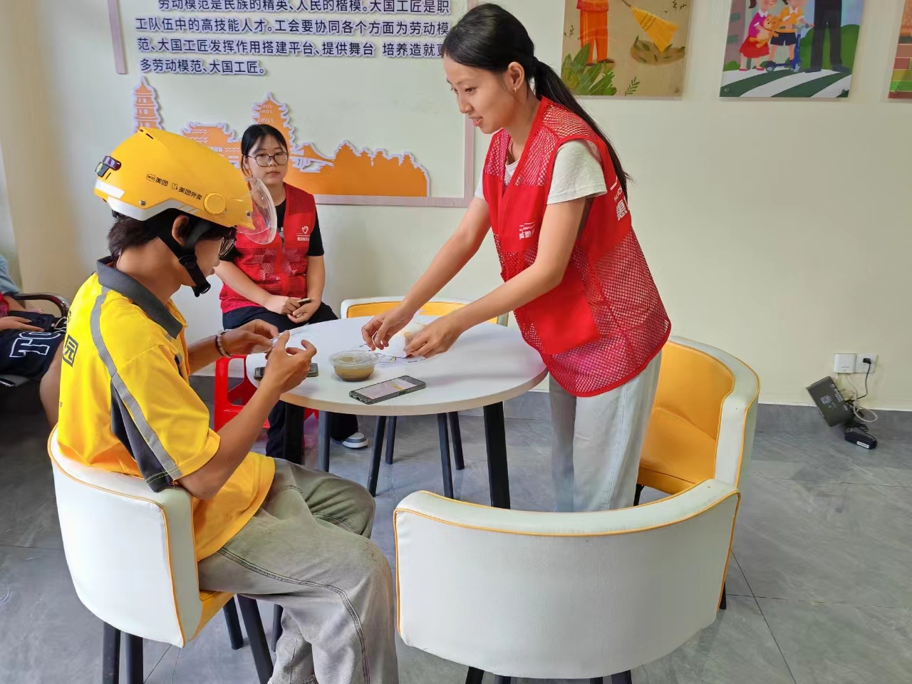 愛心驛站里,工作人員和志愿者給來到驛站休息的環衛工人、外賣騎手等戶外勞動者送上一份糖水;另一隊愛心使者則走出驛站,分赴佳兆業美團站點與順豐水北網點,將清涼的糖水送到更多勞動者的手中。