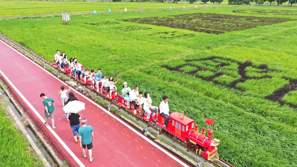 駛入墨園村,稻田一邊是長長的車龍,在第一時間告知這個網紅村的熱鬧。“嗚嗚”稻田小火車鳴笛了,坐上小火車去感受碧綠稻浪一波接著一波地涌動,秋風遇稻浪,“唰唰”作響。