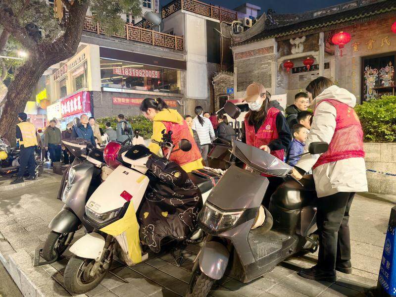 橋西街道志愿服務隊伍也積極投身其中,成為保障春節安全的重要力量。志愿者們分布在各個點位,仔細留意每一處細節。面對隨意占道經營的流動攤販,他們耐心講解規定,用真誠的態度讓小販理解配合,恢復景區周邊的整潔有序;看到亂停亂放影響市容和通行的電動車,工作人員依法依規將車輛搬運至指定區域擺放整齊。