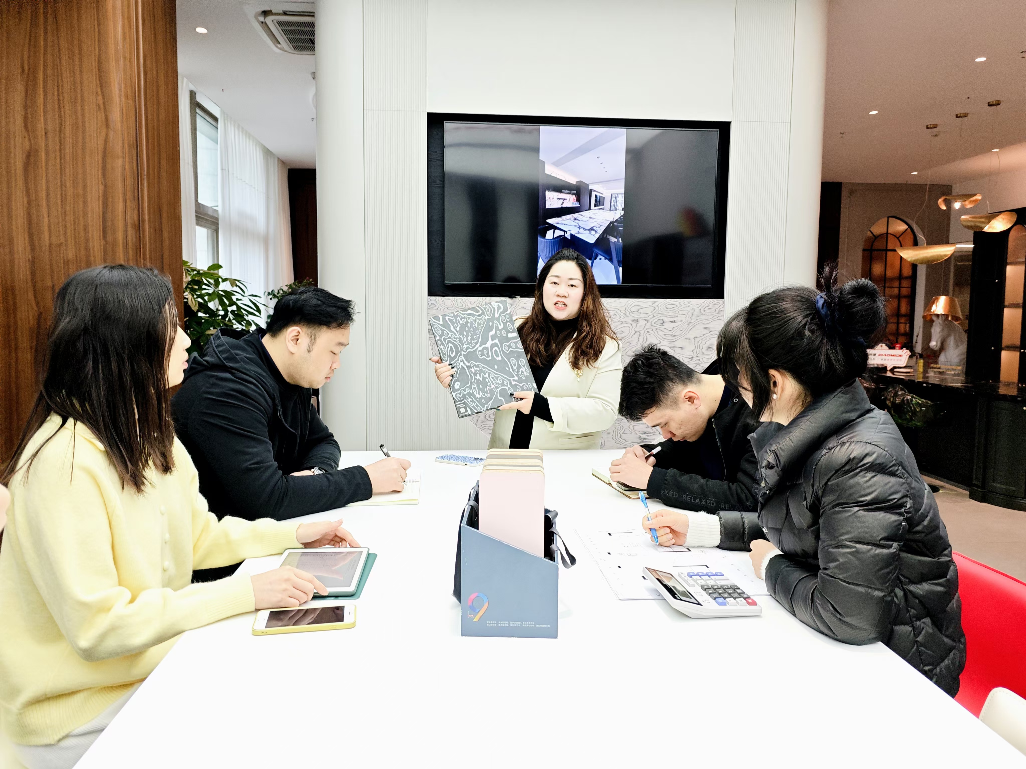 潘梅(中)與設計師們開會討論家居定制方案。
