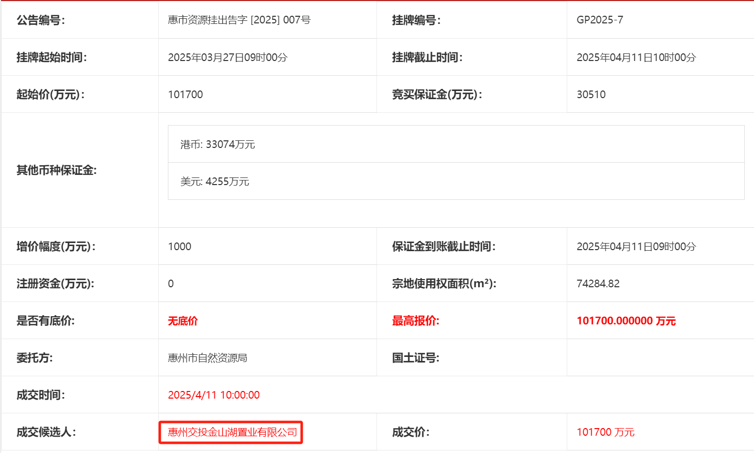 繼惠東濱海涉宅地塊、惠城區金山湖地塊成功出讓后,4月11日,惠城金龍大道東南片區JBD54-05、JBD54-06、JBD54-07地塊,被惠州交投金山湖置業有限公司以底價10.17億元摘牌,折合樓面價約4416.3元/平方米。