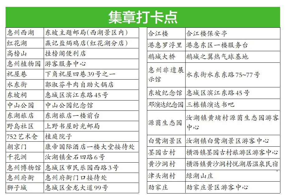 這28個(gè)集章打卡點(diǎn)不僅包括惠州西湖、紅花湖、高榜山、惠州植物園等知名景區(qū),還有水東街、祝屋巷等國(guó)家級(jí)旅游休閑街區(qū)、國(guó)家級(jí)夜間文化和旅游消費(fèi)集聚區(qū),野島社區(qū)、752藝術(shù)倉等新興青年網(wǎng)紅打卡點(diǎn)也在列。惠州非遺展示館、惠州博物館、東坡祠、中山公園、東湖旅店、朝京門、惠州府衙、合江樓等歷史人文景點(diǎn),墨園村、津頭湖村、黃沙洞村等寶藏鄉(xiāng)村也非常值得打卡。
