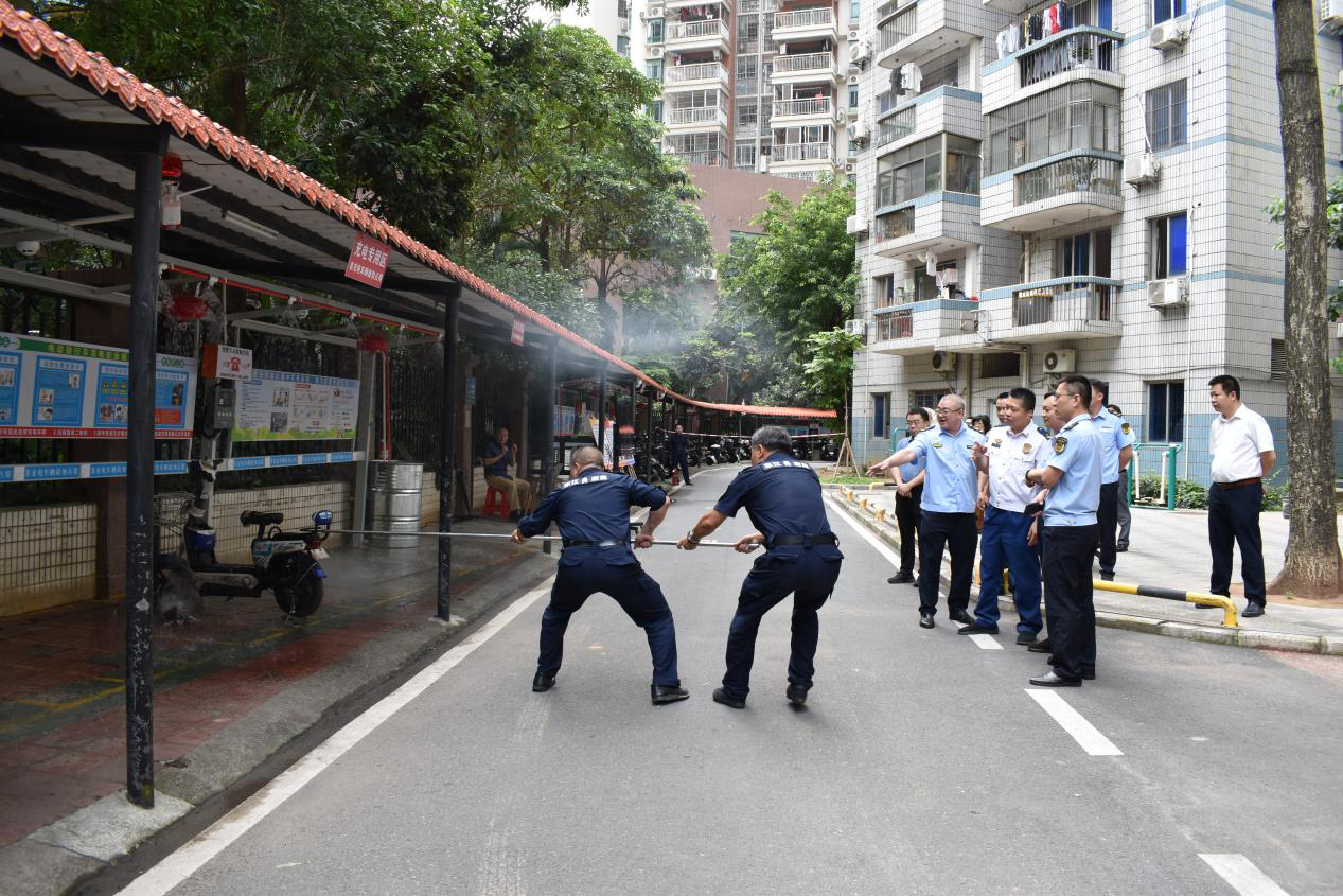金沙俊園小區開展消防演習,設備噴淋滅火后,物業人員勾出起火車輛。