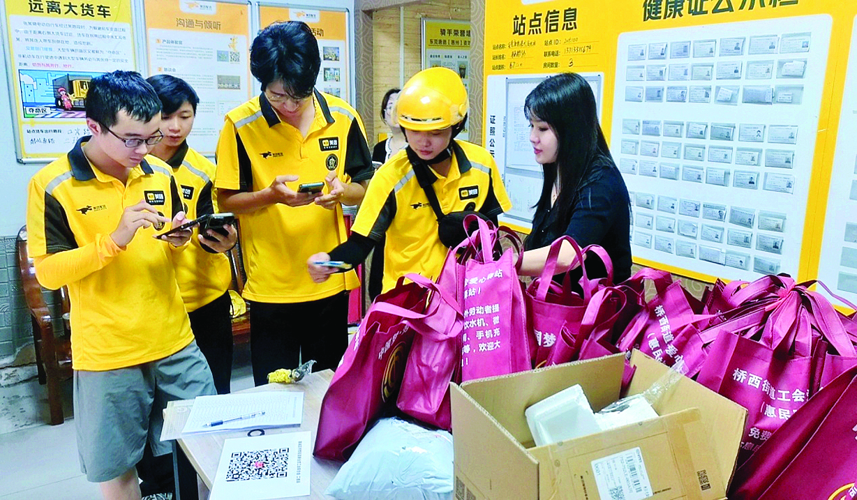工會(huì)工作人員利用配送早會(huì)、午休間隙,在街頭巷尾和站點(diǎn)門口設(shè)立臨時(shí)服務(wù)點(diǎn),為網(wǎng)約車司機(jī)、外賣騎手、快遞小哥等詳細(xì)講解工會(huì)組織的權(quán)益保障政策。