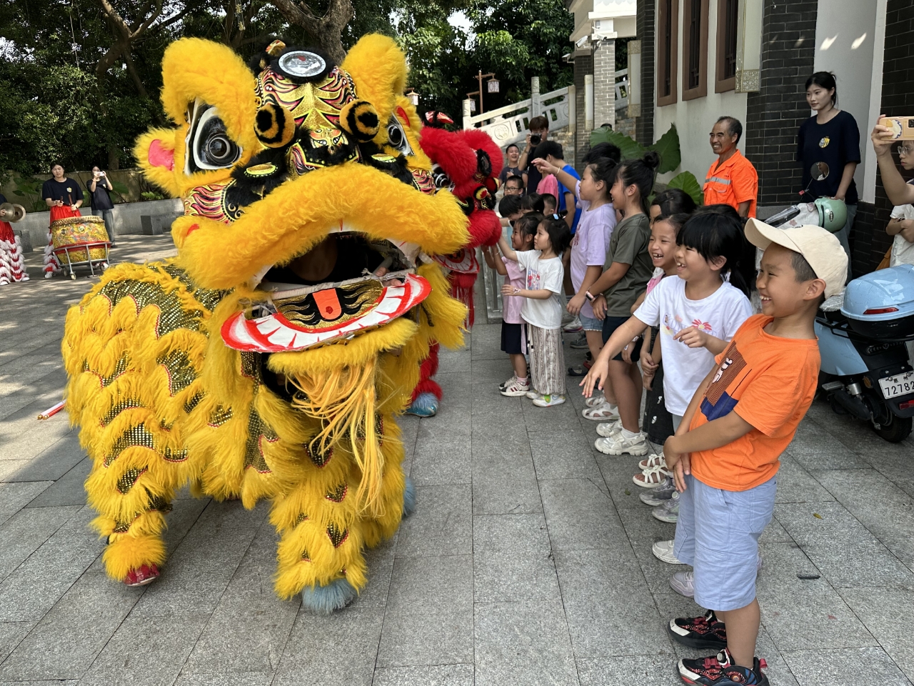 而在水北社區(qū)非遺文化傳習(xí)室,惠州衛(wèi)生職業(yè)技術(shù)學(xué)院的志愿者帶來(lái)了一群“特殊伙伴”——憨態(tài)可掬的“小獅子”。隨著鼓點(diǎn)聲響起,“小獅子”搖頭擺尾,一會(huì)兒調(diào)皮地蹭蹭孩子的手心,一會(huì)兒又突然甩頭賣(mài)萌,逗得孩子們哈哈大笑,連路過(guò)的游客都忍不住拍照定格這歡樂(lè)瞬間。