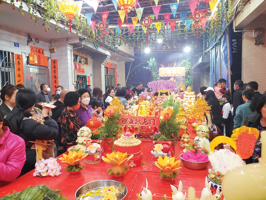 “已經3年沒這么熱鬧了。以前更多人,今年只是公家擺而已,以前我們居民都擺,更加熱鬧。”就在北大街擺盤路段路口開店的居民黃光有說。黃伯今年70歲了,從小到大每年都看一次“擺盤”!耙驗橐咔,3年沒辦了,今年終于恢復了,大家熱鬧熱鬧!秉S伯說,西北村一直有“擺盤”的習俗,鮮果蔬菜做成的工藝品是該村一些巧婦為了這一年一度的“擺盤”習俗而特意制作的。