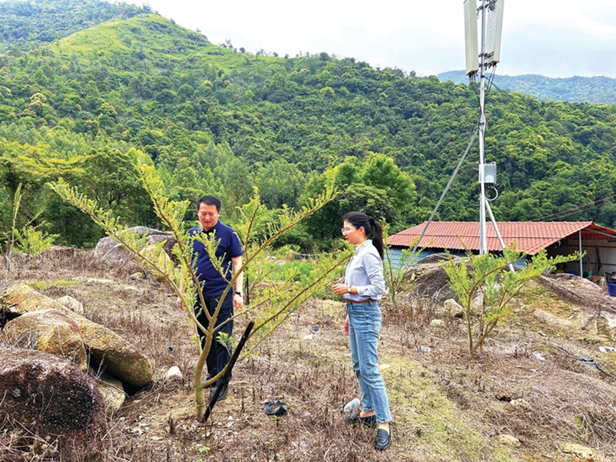 徐妙珍和同事在查看油柑種植情況。 惠州日報記者藍斐菲 攝