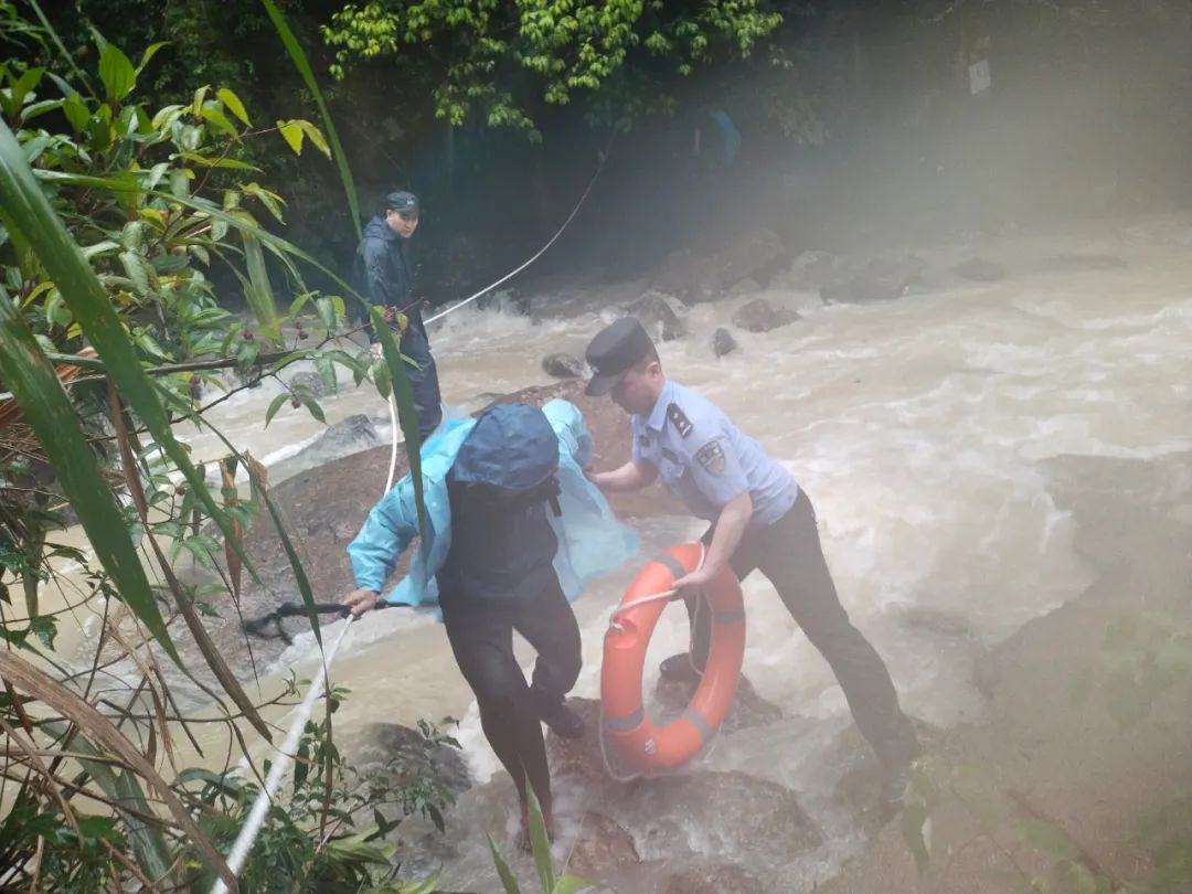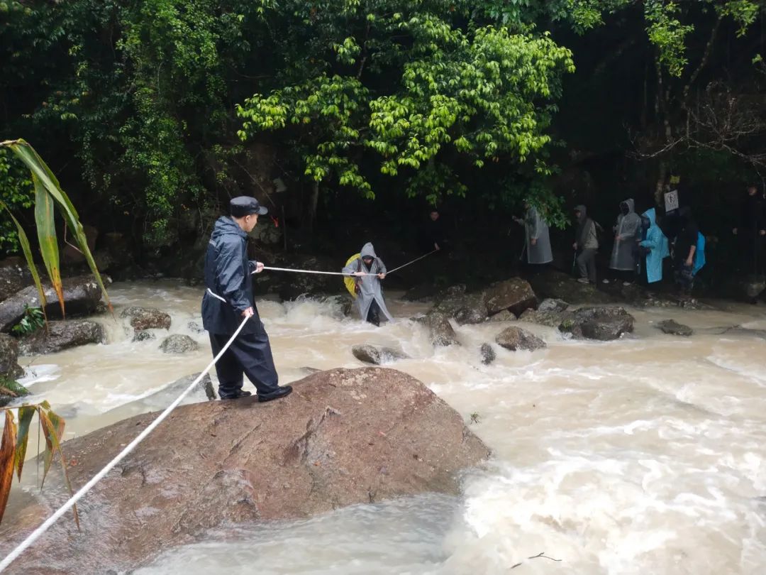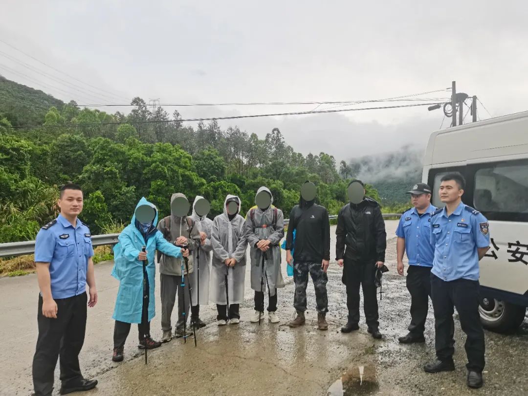 2023年5月7日下午13時,九龍峰派出所接到110轉接警情稱:在九龍峰管委會長坑村委南山村有7名驢友因下暴雨突遇河水暴漲被困山上,請求救助。接報后,值班領導立即組織警員前往救援,根據報警線索,只能確定該驢友大概的位置。山路崎嶇險峻,再加上暴雨沖刷,十分濕滑泥濘,救援人員不顧艱難疲憊,背負著救援裝備,冒雨在荊棘叢生的山路上徒步1個多小時,終于在山上找到了7名驢友。