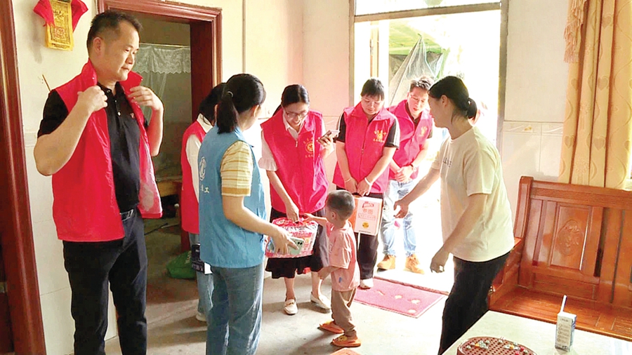 志愿者給孩子們送上慰問品。 惠州日報記者藍斐菲 特約通訊員李文聰 攝