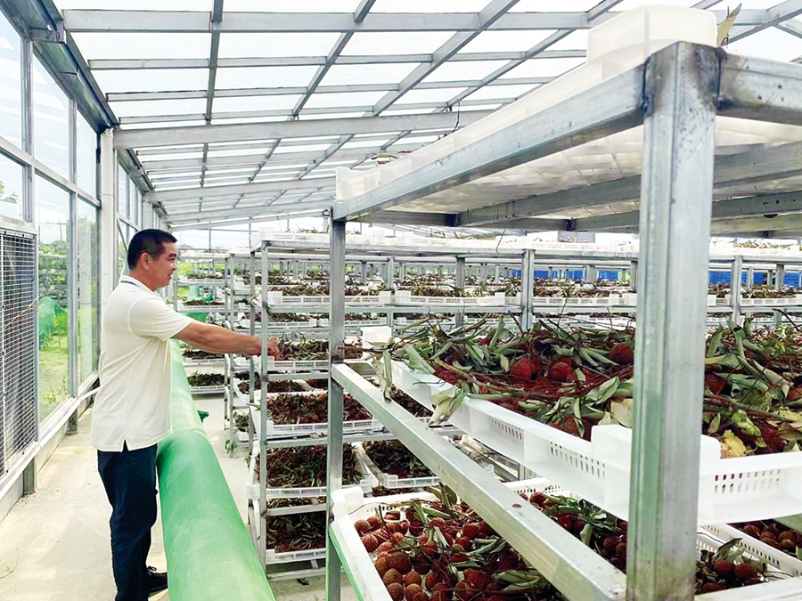 太陽能自然生曬玻璃房內荔枝整齊擺放。