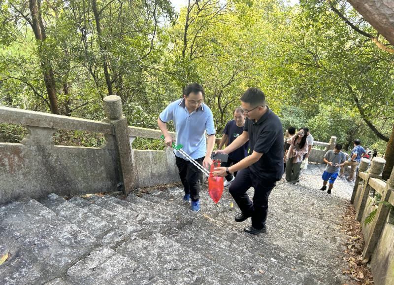 登山愛好者一邊登高望遠,一邊拾撿路邊垃圾。 惠州日報記者藍斐菲 通訊員陳超 攝