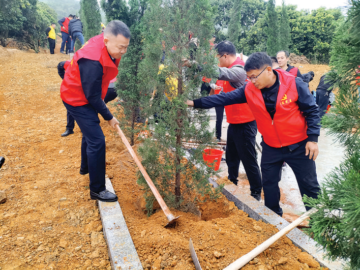 黨員干部在謝洞革命烈士紀念碑前道路兩旁種下松柏。 惠州日報記者蔡偉健 特約通訊員楊瑞發 潘佳麗 攝