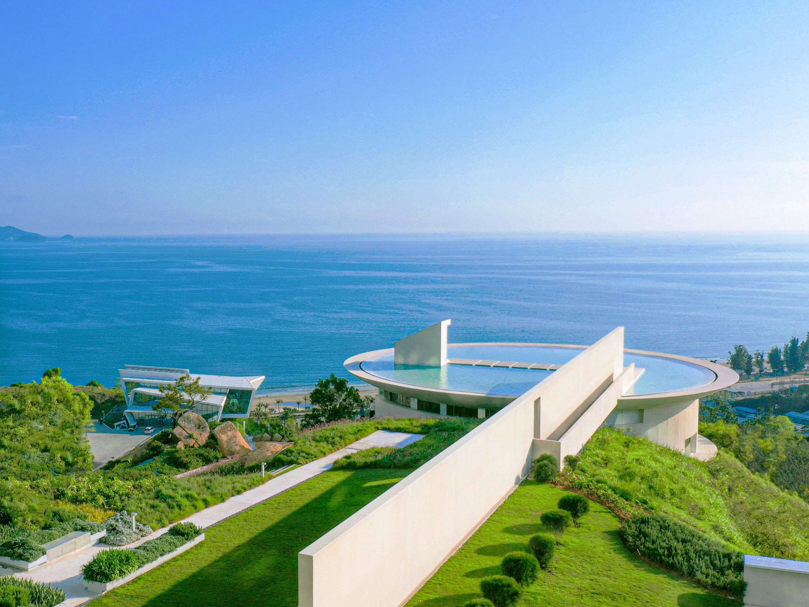 建筑主體部分平面形狀為圓形,使用空間位于水池的下方。直線是室外走廊和長墻,作為讀者和游客登臨屋頂鳥瞰大海的通道。來一滴水圖書館,一半是為了飽覽知識,另一半是為了欣賞美景。
