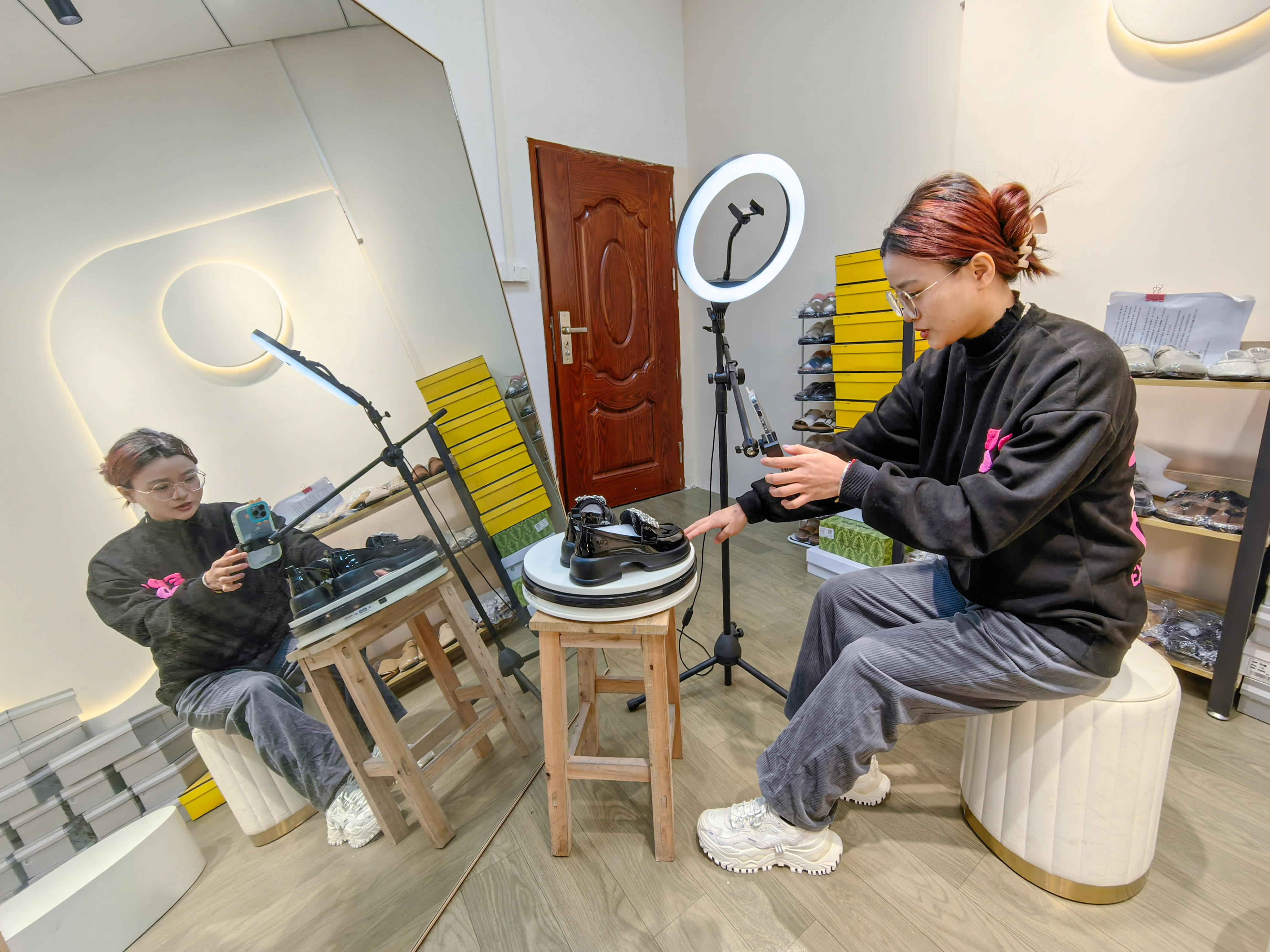 惠東女鞋企業工作人員直播帶貨。惠州日報記者陳濤 攝