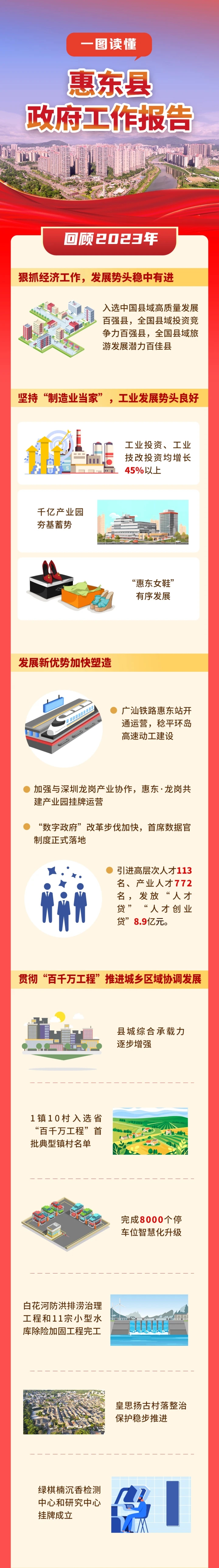 去年以來,惠東縣廣大干部群眾團結拼搏、苦干實干,搶抓發展機遇,沉著應對挑戰,經濟社會保持穩中向好的發展態勢。2024年,是實現“十四五”規劃目標任務的關鍵一年,惠東縣將以頭號工程力度實施“百千萬工程”,持續推動經濟實現質的有效提升和量的合理增長,增進民生福祉,保持社會穩定,為惠東邁進GDP千億縣行列奠定堅實基礎。
