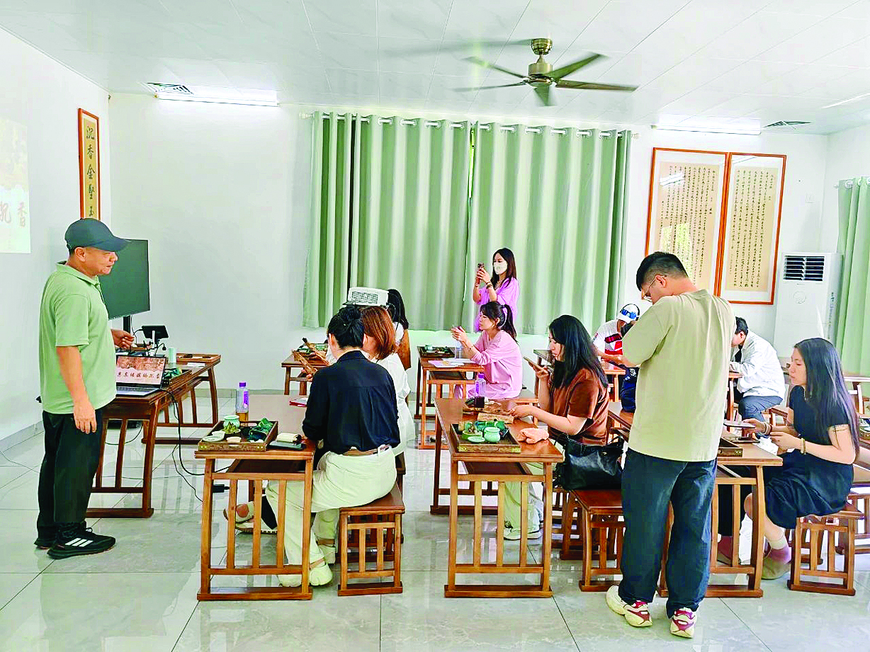 在惠東縣綠棋楠沉香種植示范基地,微店團長們跟隨惠東縣沉香協會有關負責人來到沉香種植林,詳細了解綠棋楠樹苗的生長過程、生長環境與品種優勢,沉浸式體驗現場刮香、聞香,了解沉香結香的原理等。大家還觀看了工人理香、車珠、打磨等生產過程,加深對沉香全產業鏈的了解。在沉香知識課堂上,大家深度體驗了香篆文化,學習如何判斷沉香價值,如何選擇優質沉香產品,如何辨別真假沉香等。