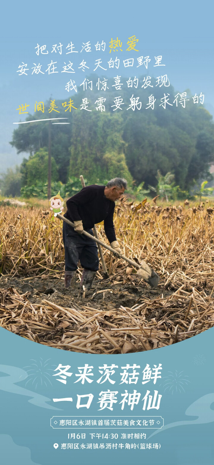 據悉,首屆茨菇美食文化節上,1月6日14:30至21:00在吊瀝村牛角嶺村小組籃球場舉行。期間,將舉行永湖特色農產品推薦、茨菇種植故事和致富經分享、“茨菇公仔”等周邊文創產品發布,市民也可以親自下田挖茨菇,買茨菇。當天,還有舞麒麟表演,惠陽名廚齊聚現場,比拼廚藝,除了傳統的客家名菜“茨菇燜豬肉”,還有各種茨菇新吃法等市民游客可以免費品嘗。晚上,將“客韻暖冬田間音樂會”表演,讓大家飽了口福再飽眼福。