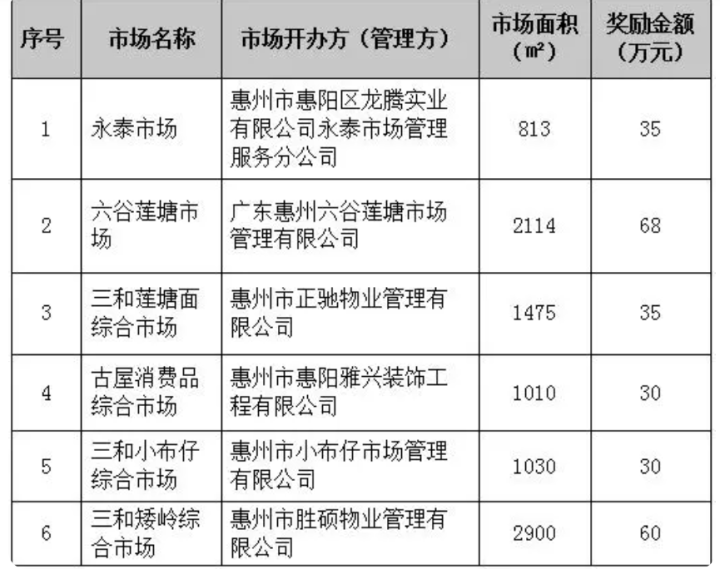免費為各農(nóng)貿(mào)市場精準(zhǔn)編制“一場一策”施工方案和施工清單;在全市率先制定出臺《惠陽區(qū)農(nóng)貿(mào)市場綜合治理提質(zhì)升級獎勵辦法》,對按標(biāo)準(zhǔn)、積極開展農(nóng)貿(mào)市場提質(zhì)升級的市場給予最高100萬元的資金獎勵;引入金融機(jī)構(gòu)對接農(nóng)貿(mào)市場,幫扶企業(yè)和商戶解決資金問題,放發(fā)相關(guān)低息貸款5840萬元……