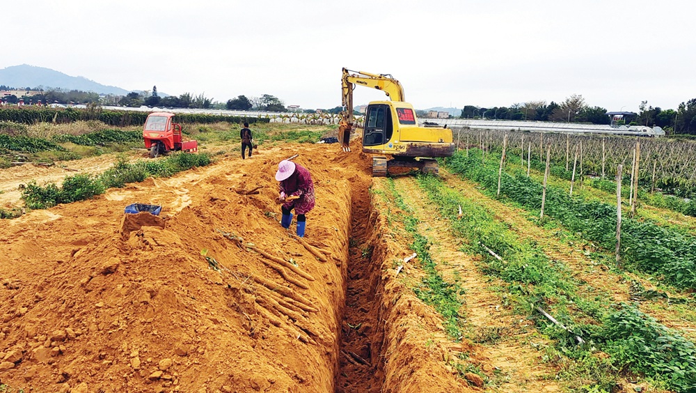 農田就是公園,公園就是農田。行走在淮山農業公園,一排排綠植爬滿了支架,綠植的根部就是新圩村特色農作物——淮山、粉葛。田地里,有村民坐在小板凳上開挖,有村民請來挖土機幫忙,一根根粗壯結實的淮山、粉葛從沙土中露出來,大家小心地將它們拔出來,整齊地排在田間,等待最后打包。