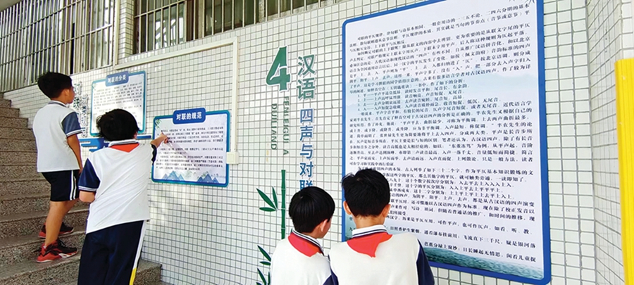 學(xué)生在學(xué)校走廊觀看楹聯(lián)知識;葜萑請(bào)記者李芳娟 通訊員葉其甫 攝