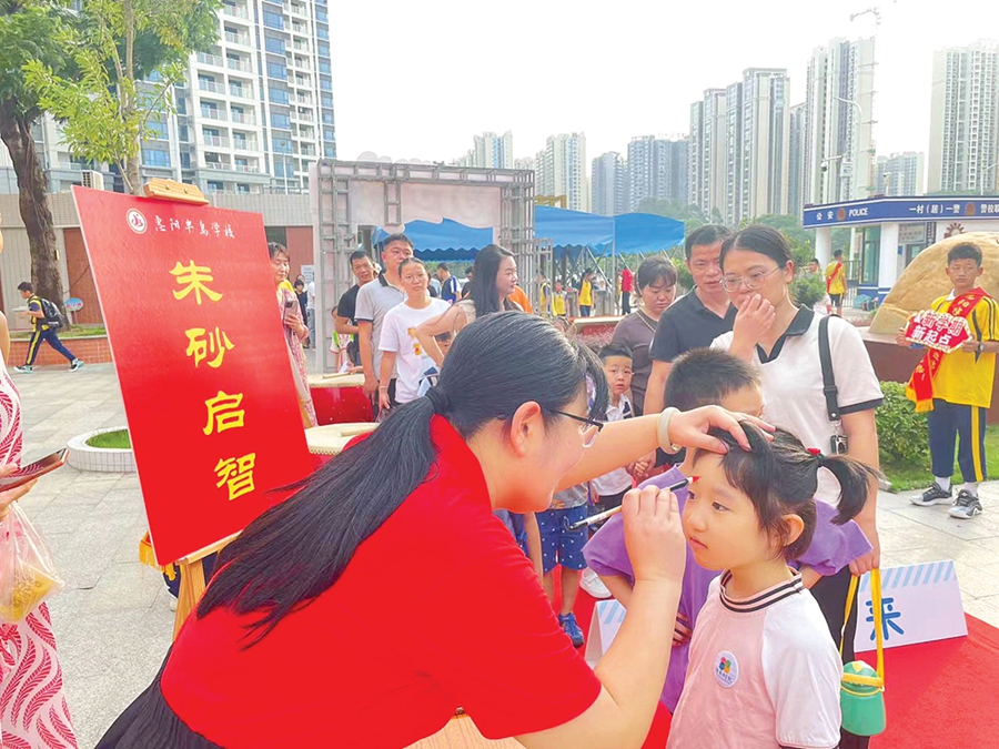 在惠陽半島學校,開學首日舉行了以“加油開學季,筑夢向未來”為主題的新生入學儀式。老師們在每一個孩子的眉心點上一顆朱砂痣,寓意啟蒙開智。