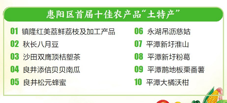 惠陽農(nóng)業(yè)資源豐富,農(nóng)產(chǎn)品種類繁多,農(nóng)業(yè)農(nóng)村發(fā)展前景和潛力巨大。據(jù)介紹,惠陽以惠州市慶祝2023年“中國農(nóng)民豐收節(jié)”為契機(jī),開展第一屆十佳農(nóng)產(chǎn)品“土特產(chǎn)”評選活動,旨在挖掘本地“土”“特”“優(yōu)”農(nóng)產(chǎn)品,促其走向更廣闊的市場。其評選周期為每三年一屆,每屆舉辦一次評選活動。