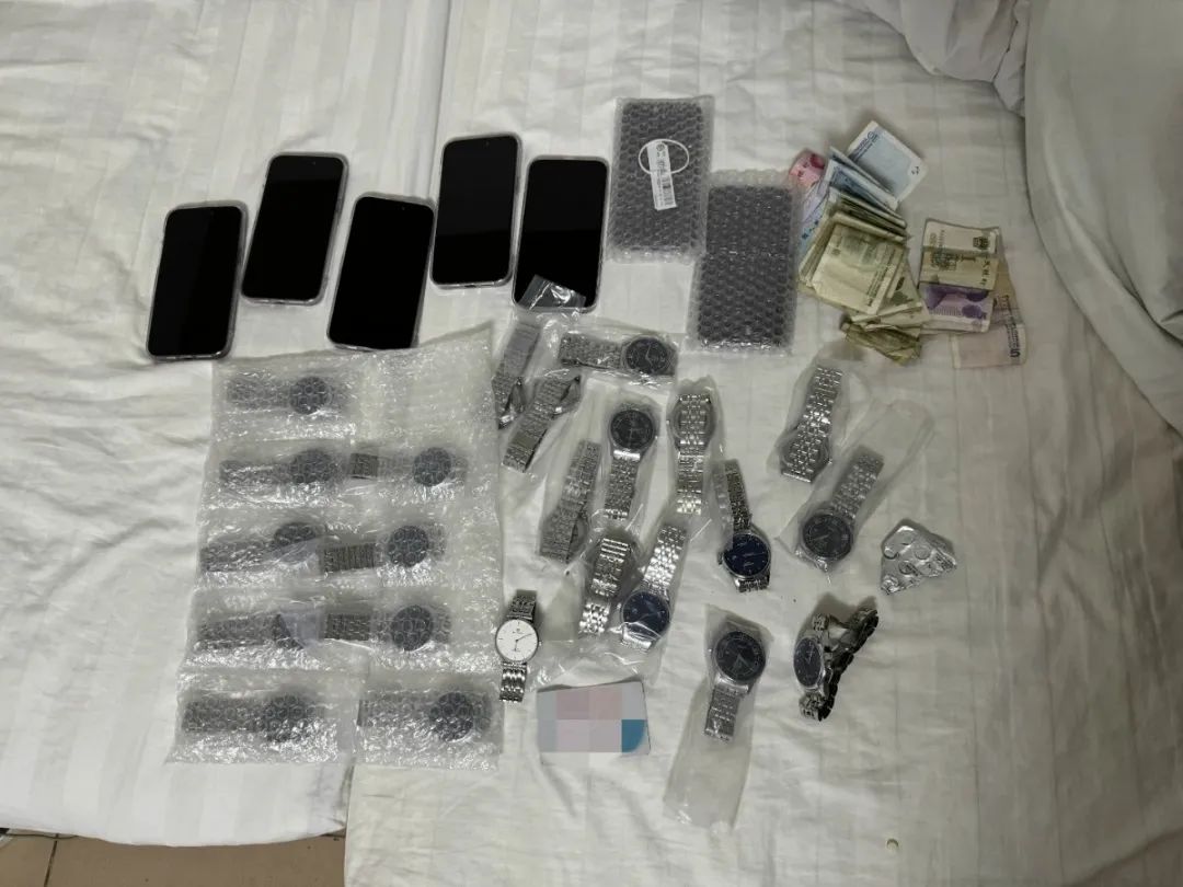 11月17日下午,辦案民警在秋長街道秋南秋寶路一家賓館內抓獲犯罪嫌疑人姜某等8人,現場收繳高仿手機15部、假名牌手表24塊。
