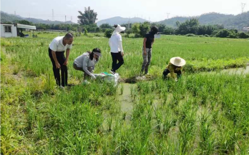 農技人員田間地頭指導農戶防治病蟲害。 惠州日報記者許文昌 通訊員李冬嫻 攝