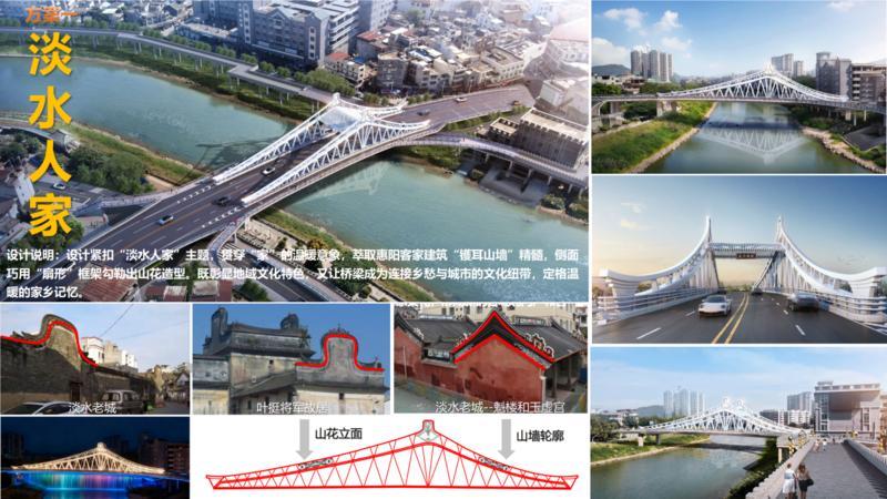 設計說明:設計錨定淡水老城的居民、宗祠、書院及紅色革命建筑等文化載體,提取其人字坡屋頂、鍋耳式等地域特色元素,融入桁架結構的線條與形態中,讓橋體成為老城建筑肌理的具象延伸,與老城文脈自然呼應。