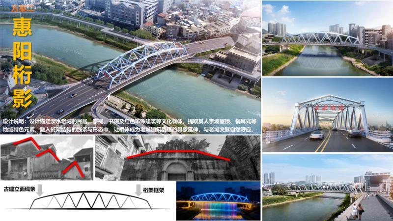 設計說明:設計緊扣“淡水人家”主題,貫穿“家”的溫暖意象,萃取惠陽客家建筑“鑊耳山墻”精髓,側面巧用“扇形”框架勾勒出山花造型。既彰顯地域文化特色,又讓橋梁成為連接鄉愁與城市的文化紐帶,定格溫暖的家鄉記憶。