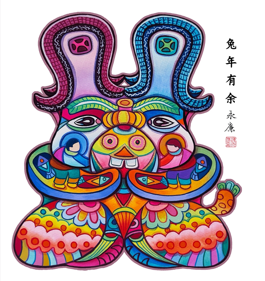 卯兔位列十二生肖之四,“卯”代表春意,代表黎明,充滿無限生機,“兔”的諧音則有揚眉吐(兔)氣、前途(兔)似錦、大展宏圖(兔)等,蘊含美好寓意。85后畫家鐘永廉創作的《瑞兔呈祥賀新年》系列作品,包括《兔氣揚眉》《兔年有余》《兔露心聲》《瑤兔獻瑞》《I love you 兔》等,傳統與現代結合,色彩鮮艷,造型生動,展現對生活美好的祝愿。